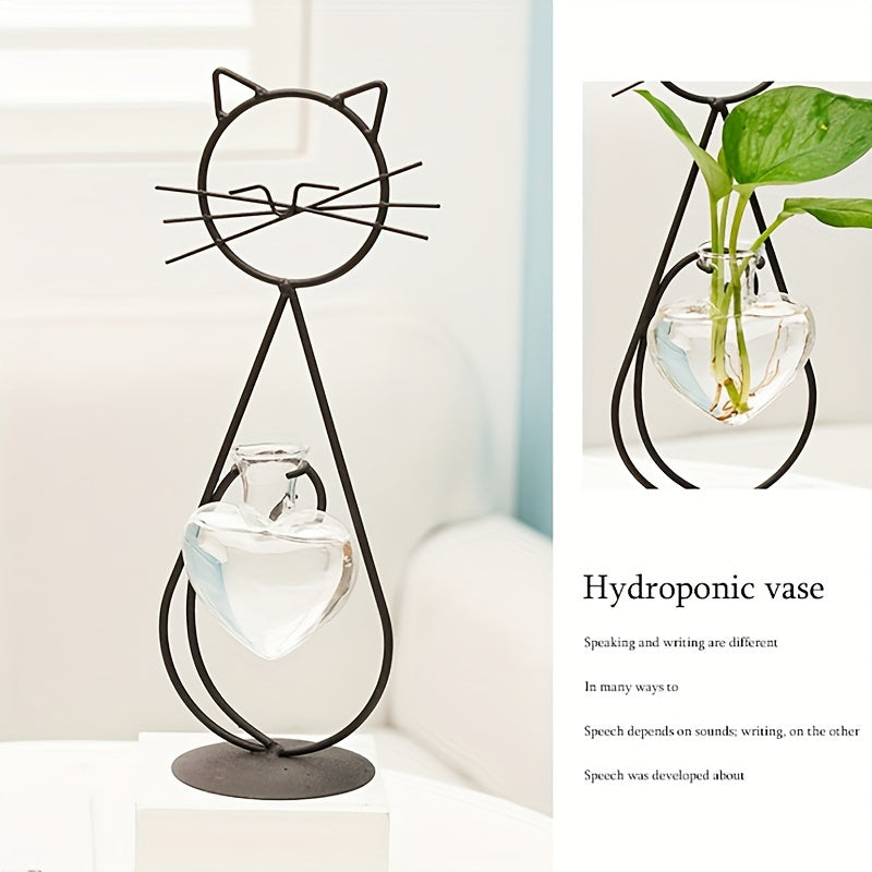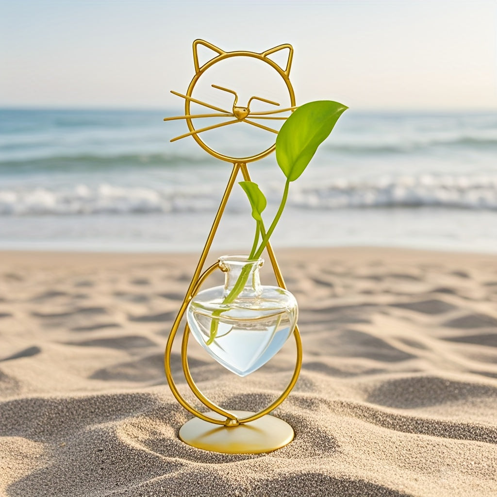 Minimally Designed Cat Shaped Wrought Iron Vase with Heart-shaped Small Glass Vase And Golden Metal Support Plant Rack, Suitable for Home Wedding Decoration\u002Fdesktop Glass Flowerpot Vase Rack, Creative Decoration for Home Terrace Lawn Garden