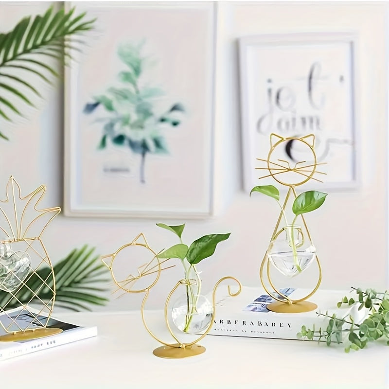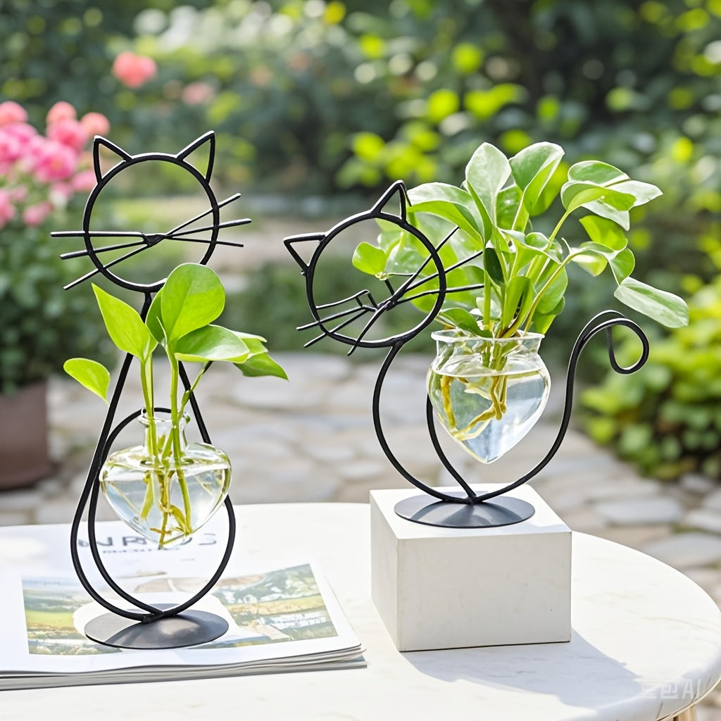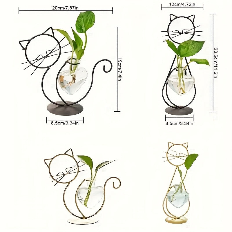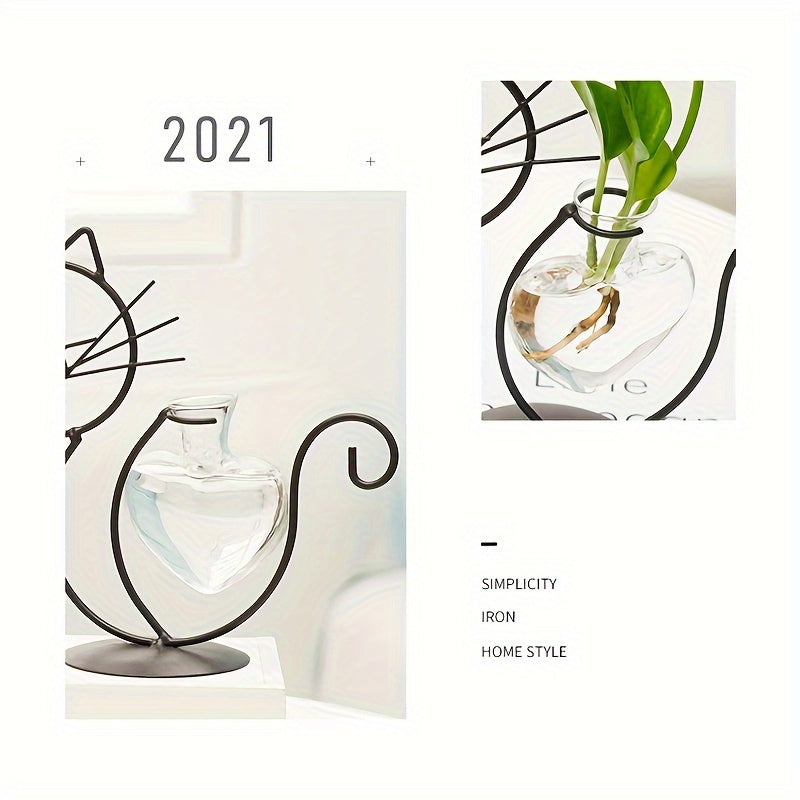 Key Features: Unique features related to Minimally-Designed-Cat-Shaped-Wrought-Iron-Vase-with-Heart-shaped-Small-Glass-Vase-And-Golden-Metal-Support-Plant-Rack/-Suitable-for-Home-Wedding-Decoration\u002Fdesktop-Glass-Flowerpot-Vase-Rack/-Creative-Decoration-for-Home-Terrace-Lawn-Garden. Such as a creative design with a combination of different elements.